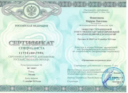 Флянтикова Марина Павловна, закончила ООО “Многопрофильную академию развития и технологий” по направлению - Сестринское дело.